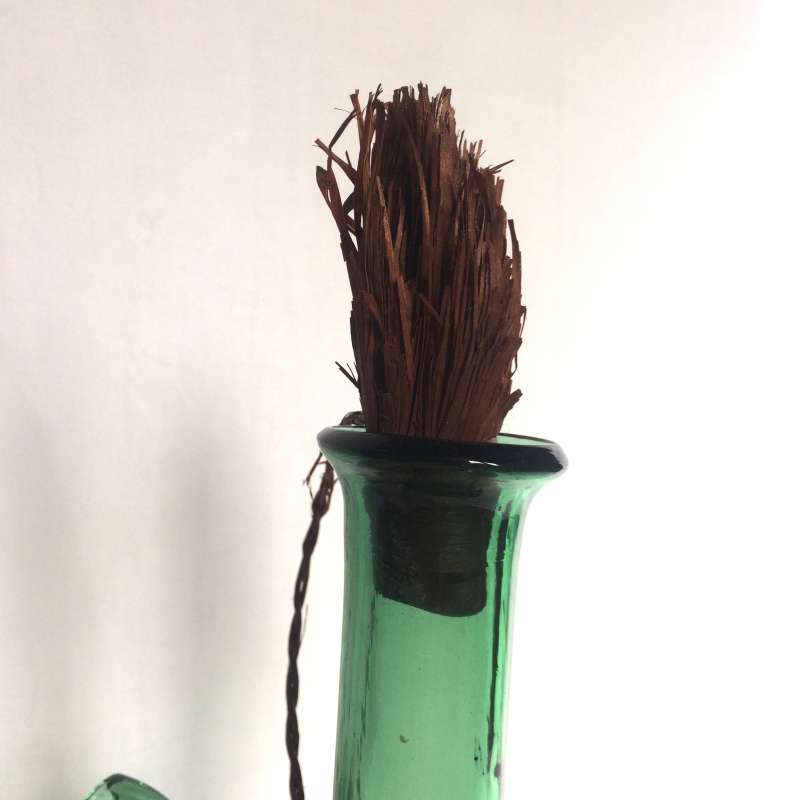glass bottle, parts in wicker