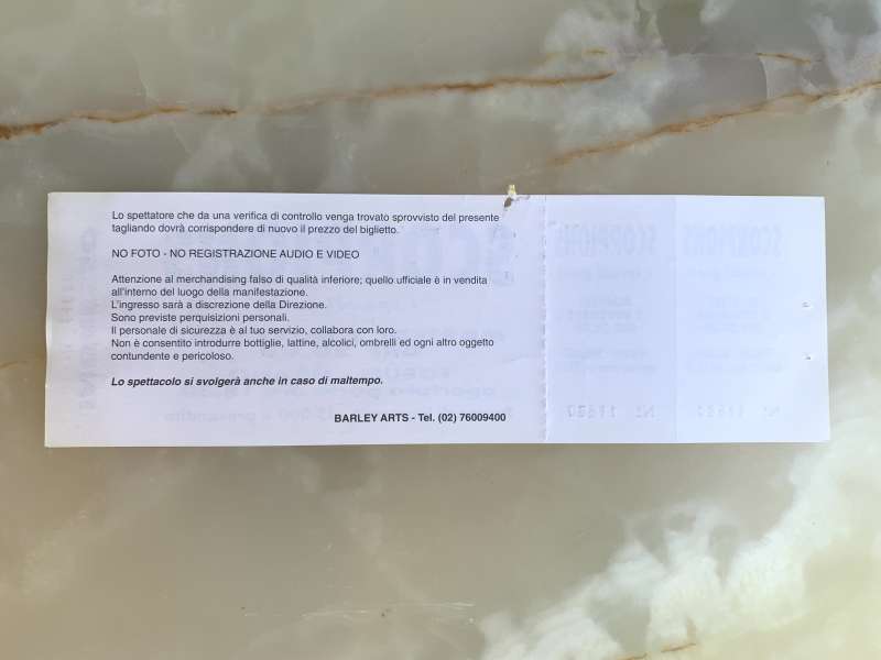 biglietto originale invenduto del concerto degli Scorpions al Forum di Milano il 2 novembre 1993 guest Duff McKagan per il Face The Heat Tour. Il biglietto è completo di matrice perché non è stato venduto: materiale originale raro ed unico per veri collezionisti, recuperato presso l’agenzia che ha organizzato il concerto, disponibile in quantità limitata.