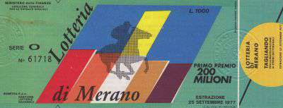 biglietto LOTTERIA DI MERANO anno 1977 design by Ernesto Valentino serie O n. 61718